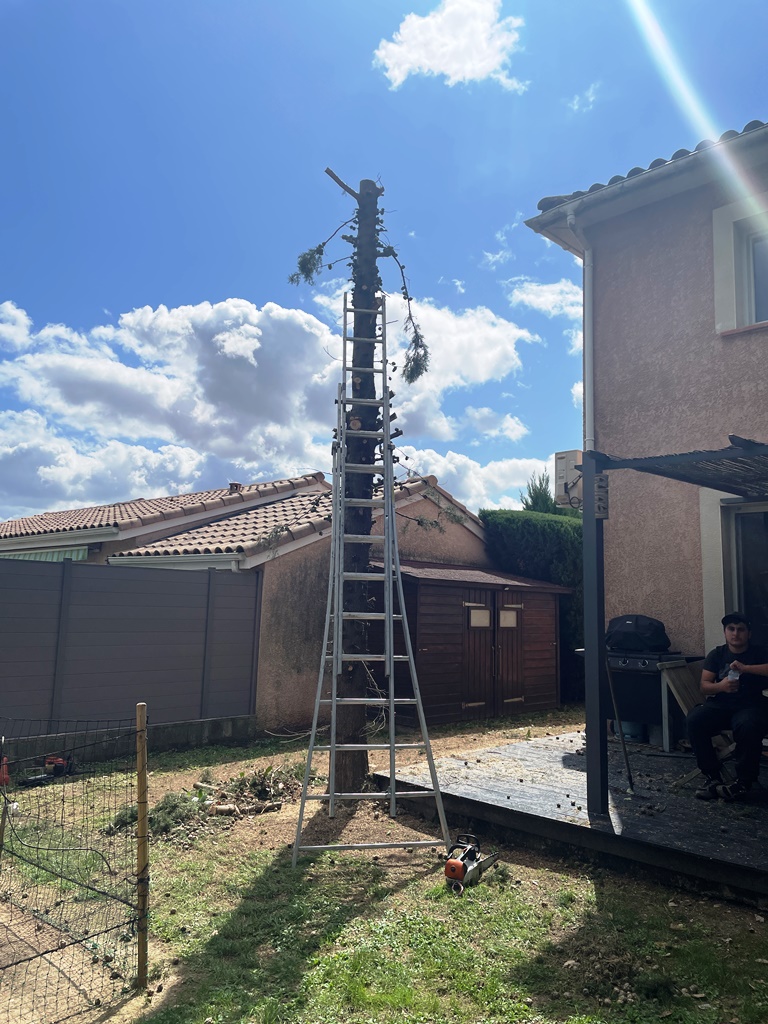 Compte tenu de la proximité immédiate de la maison et de la terrasse, l’abattage par démontage était la seule option envisageable. Cette technique consiste à découper l’arbre section par section. Notamment en commençant par les branches supérieures et en descendant progressivement vers le tronc.