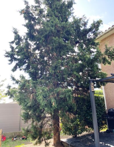 - Les branches : elles atteignaient déjà la toiture de la maison, augmentant les risques de frottement, de dégradation de la couverture, et de chute de branches lors d’intempéries.